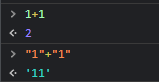 먼저 숫자형이다. 숫자형의 데이터 타입을 처리를 하려면 숫자가 입력이 되면 된다. 분명 1,2,3,4,5..... 은 숫자인 건 확실하다. 그럼 그 숫자로 간단한 연산처리를 해보자 저번 학습 중에 간단한 문제를 쉽게 처리할 수 있는 방법이 있었다. 바로 콘솔을 활용하는 것이다. 1+1을 콘솔을 통해 처리해보면