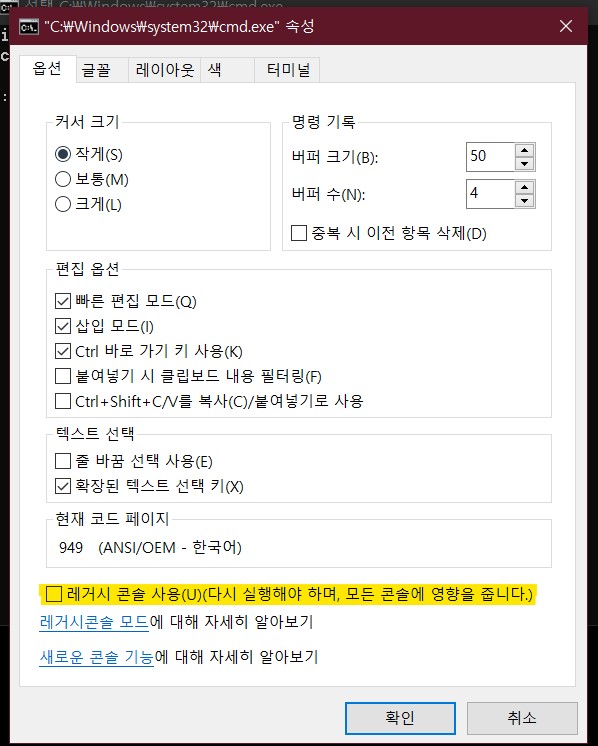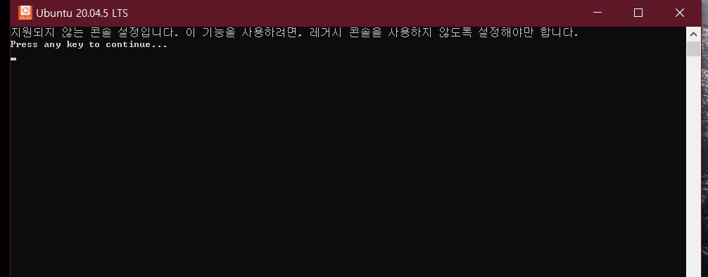 레거시 콘솔 사용이라고 적혀있는 칸에 체크가 해제되어있어야 Ubuntu를 실행하였을 때 정상 작동하게 된다.